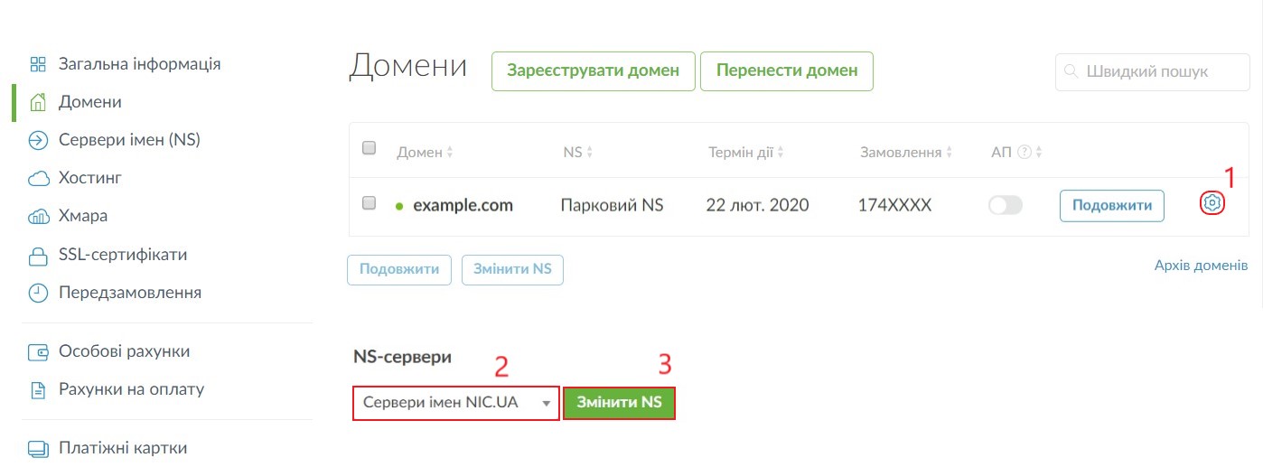 - Керування записами виконується у розділі «Сервери імен (NS)». Натисніть на шестерню біля потрібного домену і кнопку «Змінити».