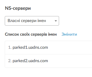 Потрапивши на сторінку налаштувань, знайдіть розділ «NS-сервери». Вам потрібно вибрати з переліку «Власні сервери імен» і натиснути на кнопку «Змінити» біля заголовку "Список своїх серверів імен".
