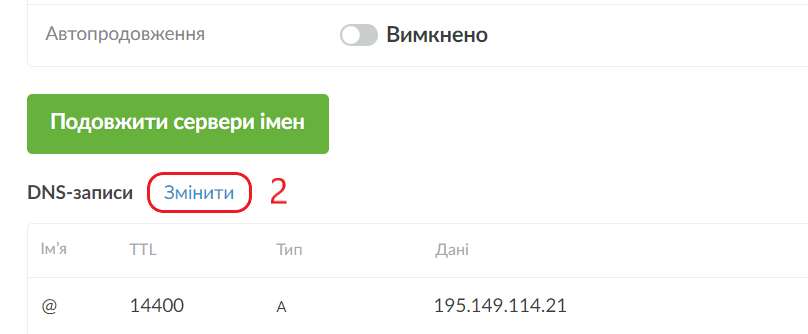 Нижче на сторінці натисніть на кнопку "Змінити" (2) біля заголовку "DNS-записи".
