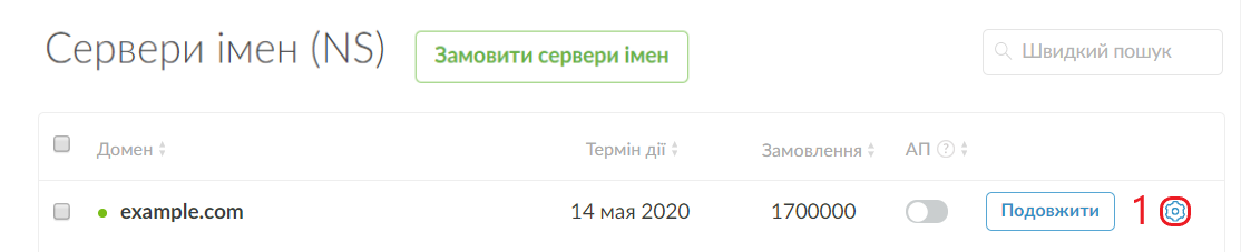 Підтверждення права власності на домен виконується за допомогою додавання TXT-запису. Для цього перейдіть до розділу "Сервери імен (NS)" і натисніть на шестерню біля замовлення (1).
