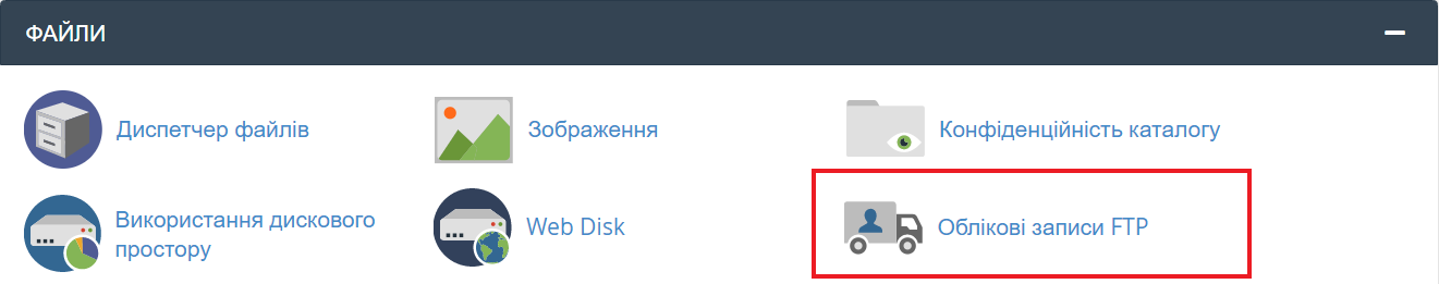 Для цього в панелі хостингу cPanel знайдіть розділ "Облікові записи FTP".
