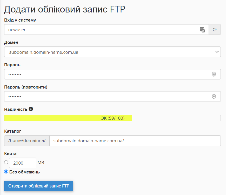 Після заповлення всіх потрібних полів натисніть кнопку "Створити обліковий запис FTP"