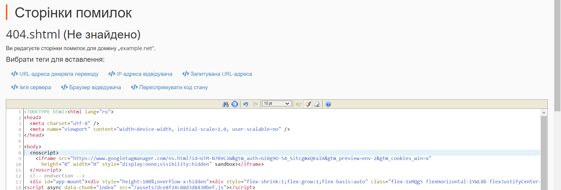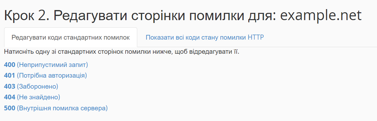 На наступному кроці оберіть для якої помилки бажаєте відредагувати сторінку. За замовчуванням відображається перелік стандартних помилок. При цьому можете перейти на другу вкладку, якщо бажаєте відредагувати шаблони для інших помилок.