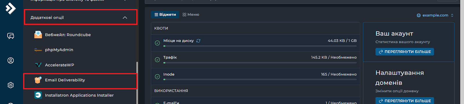 Перейдіть в панель хостингу DirectAdmin і знайдіть розділ "Додаткові опції". У ньому оберіть підрозділ “Email Deliverability”.