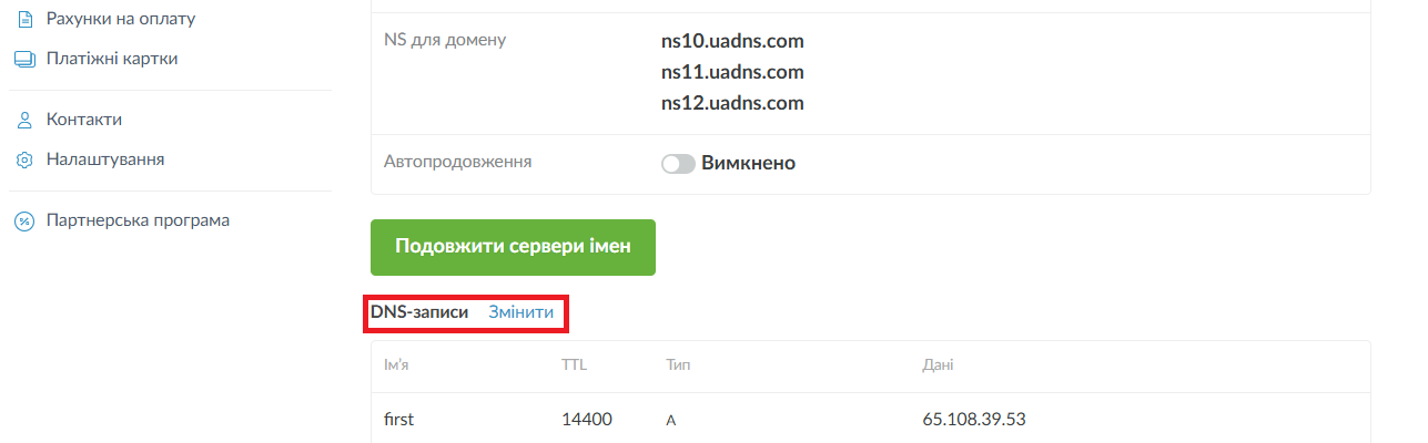 У властивостях замовлення знайдіть заголовок “DNS-записи” і натисніть кнопку "Змінити".