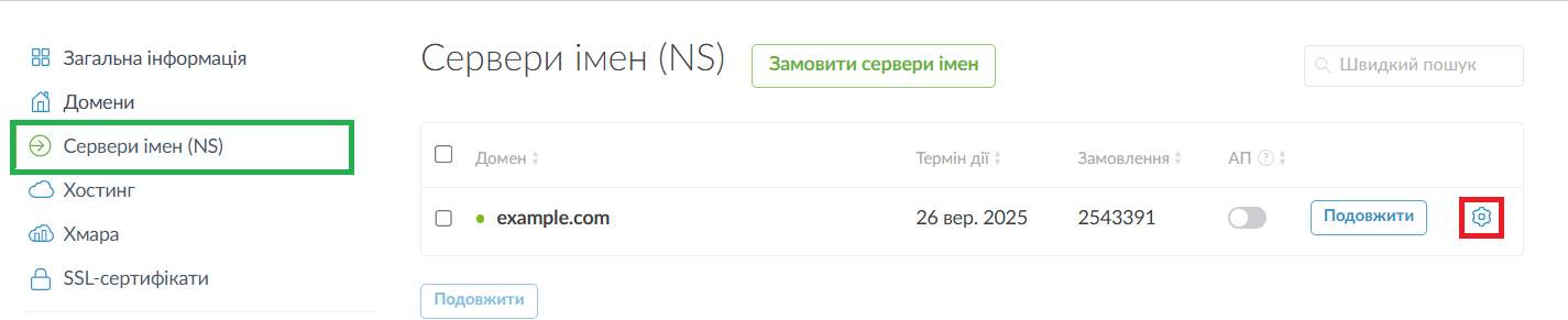 Якщо у домені використовуються власні NS-сервери, зверніться до підтримки свого DNS-провайдера. Якщо у домені використовуються сервери імен NIC.UA, перейдіть до розділу "Сервери імен (NS)". Знайдіть у переліку потрібний домен і натисніть на кнопку у вигляді шестерні біля нього.
