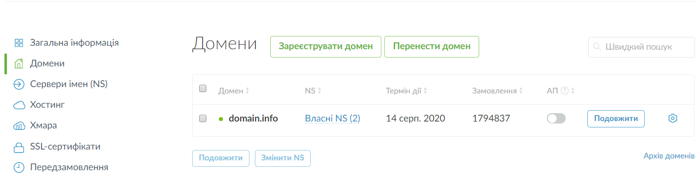 Після цього перейдіть до розділу «Домени» і знайдіть домен, який бажаєте продовжити. Далі натисніть на кнопку "Продовжити".