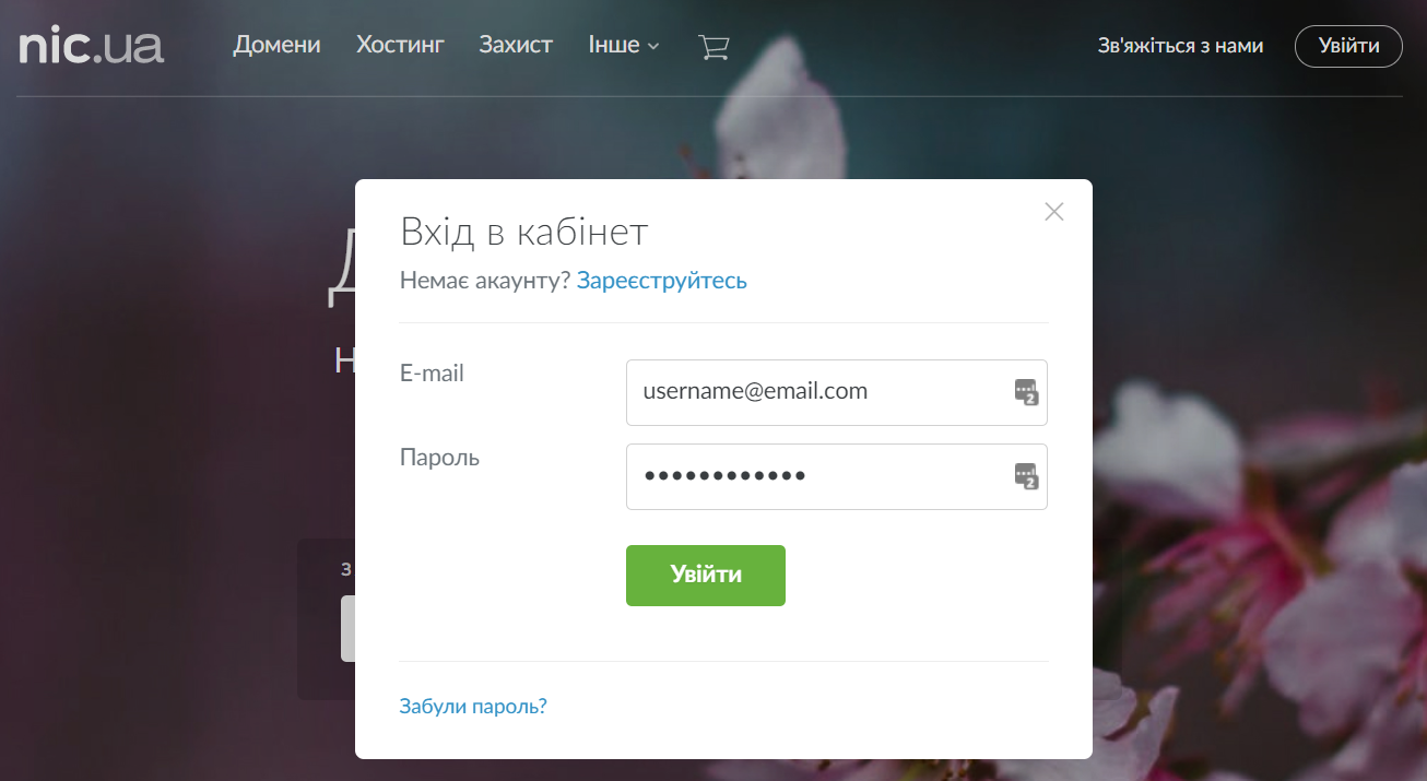 Для продовження терміну дії домену слід авторизуватися в особистому кабінеті на сайті NIC.UA, використовуючи логін (email) і пароль.