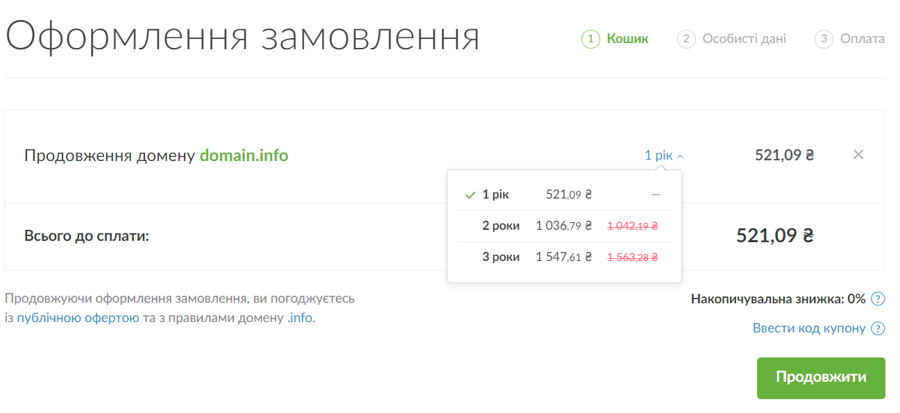 Далі потрапите до кошику для оформлення замовлення. На першому кроці оберіть термін, на який хочете продовжити домен.