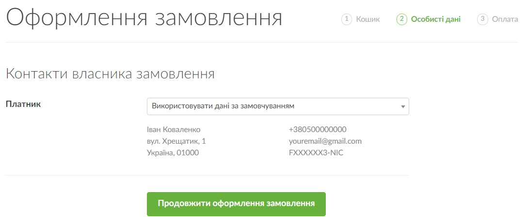 Наступним кроком оберіть платника: за замовчуванням використовуються дані власника акаунту. Якщо хочете вказати іншу фізичну або юридичну особу, натисніть на перелік з назвою "Використовувати дані за замовчуванням" і додайте новий контакт.