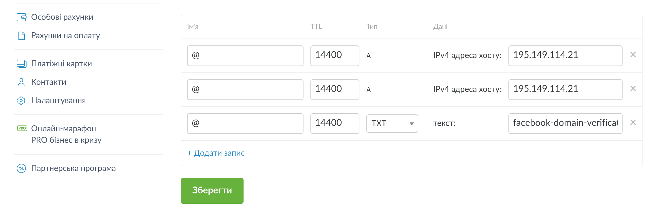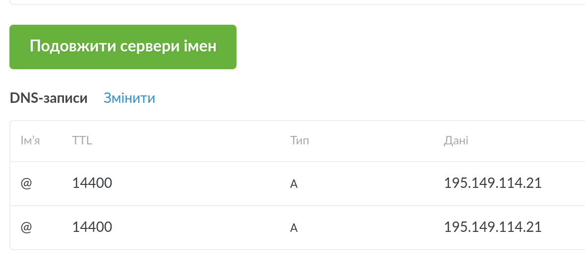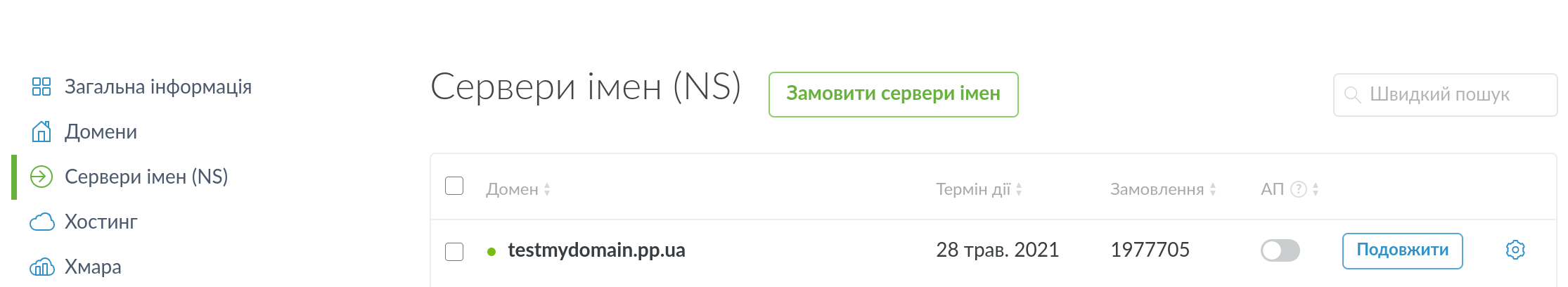 Переконайтесь, що в домені використовуються "Сервери імен NIC.UA". Для подальших налаштувань переходите у меню "Сервери імен NS":