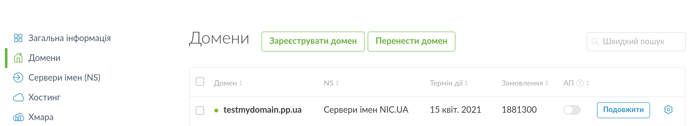 Копіюєте цей рядок і переходите в меню особистого кабінету NIC.UA "Домени".