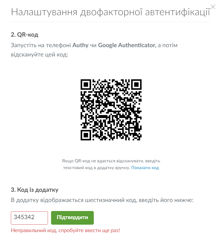 Помилка при підключенні двухфакторної автентифікації (2FA). Не приймається код.