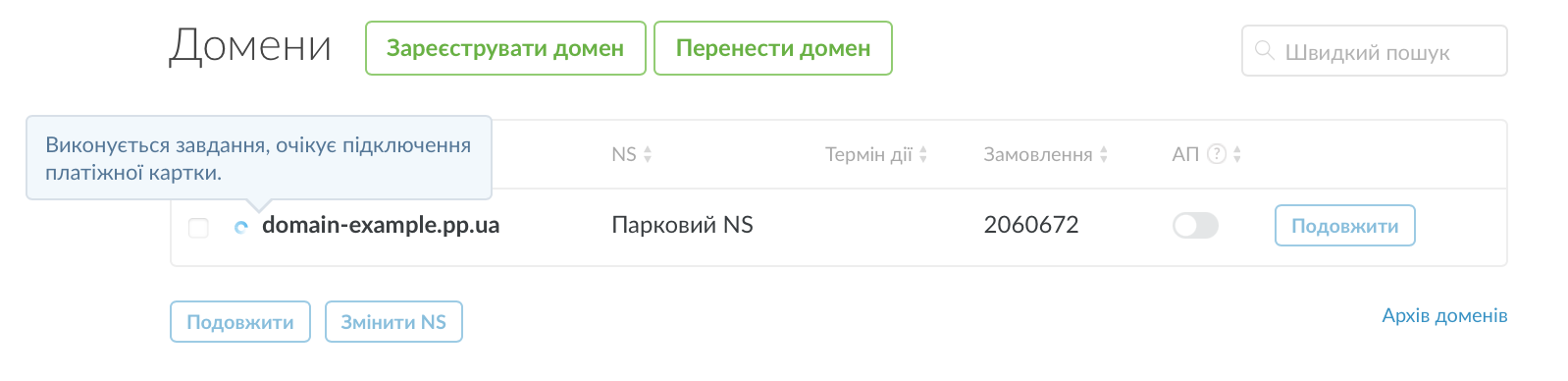 При оформленні замовлення на безкоштовний PP.UA домен або пробний період хостингу можна помітити, що замовлення не оформилося одразу. Праворуч від замовлення буде маленький значок завантаження, а при наведенні курсору на нього з'являється сповіщення про необхідність підключити платіжну картку.