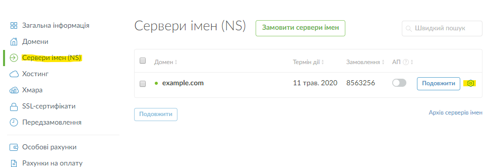 - Виберіть потрібний домен зі списку і натисніть на шестірню;