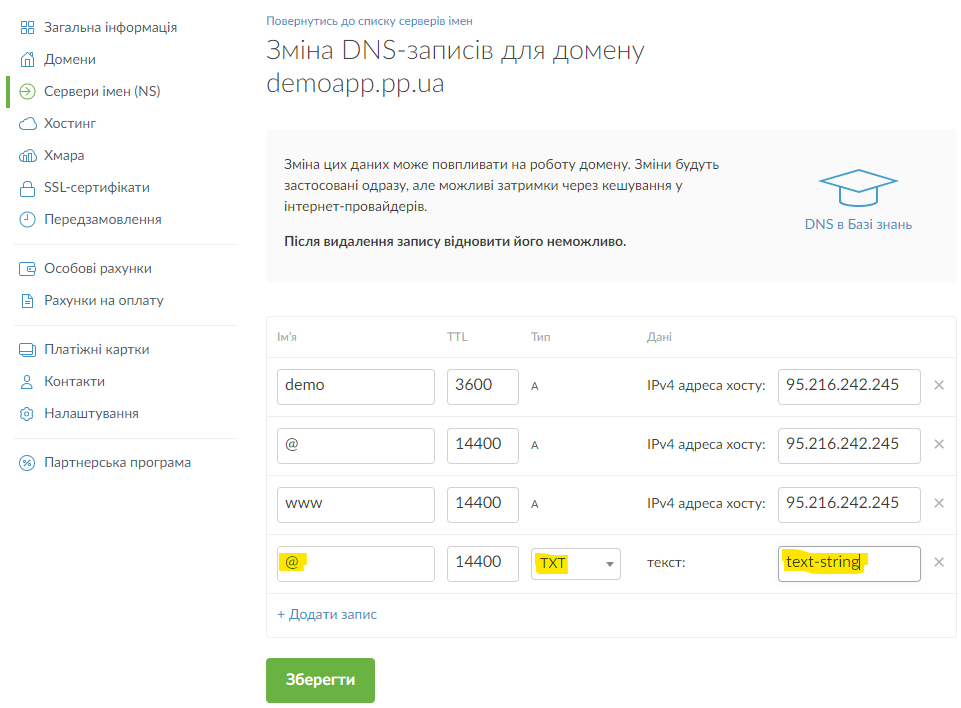 - Відкриється сторінка з DNS-записами домену, вам потрібно буде натиснути на кнопку "Змінити";