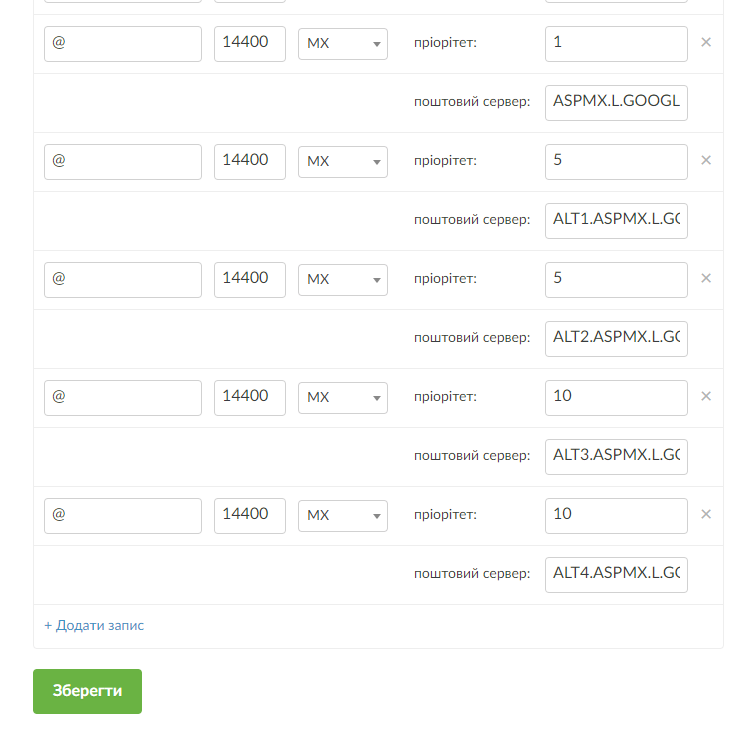 Список MX-записів G Suite (він ще є і на сайті підтримки Google):