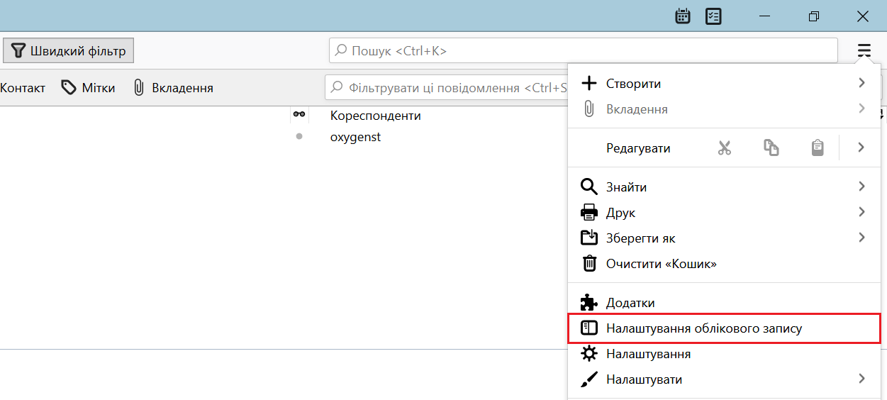 Спочатку запустіть програму Thunderbird і натисніть на кнопку меню в правому верхньому кутку. В меню оберіть розділ "Налаштування облікового запису".