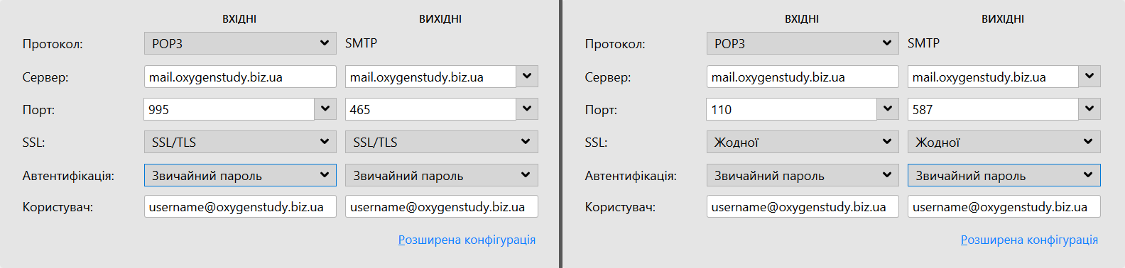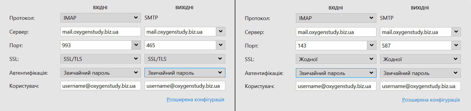 Зліва показані налаштування для захищеного з'єднання з сервером, праворуч — налаштування для підключення до сервера без шифрування даних (незахищене з'єднання).