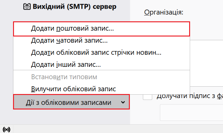 Далі в лівому нижньому кутку натисніть кнопку "Дії з обліковими записами" і оберіть "Додати поштовий запис...".