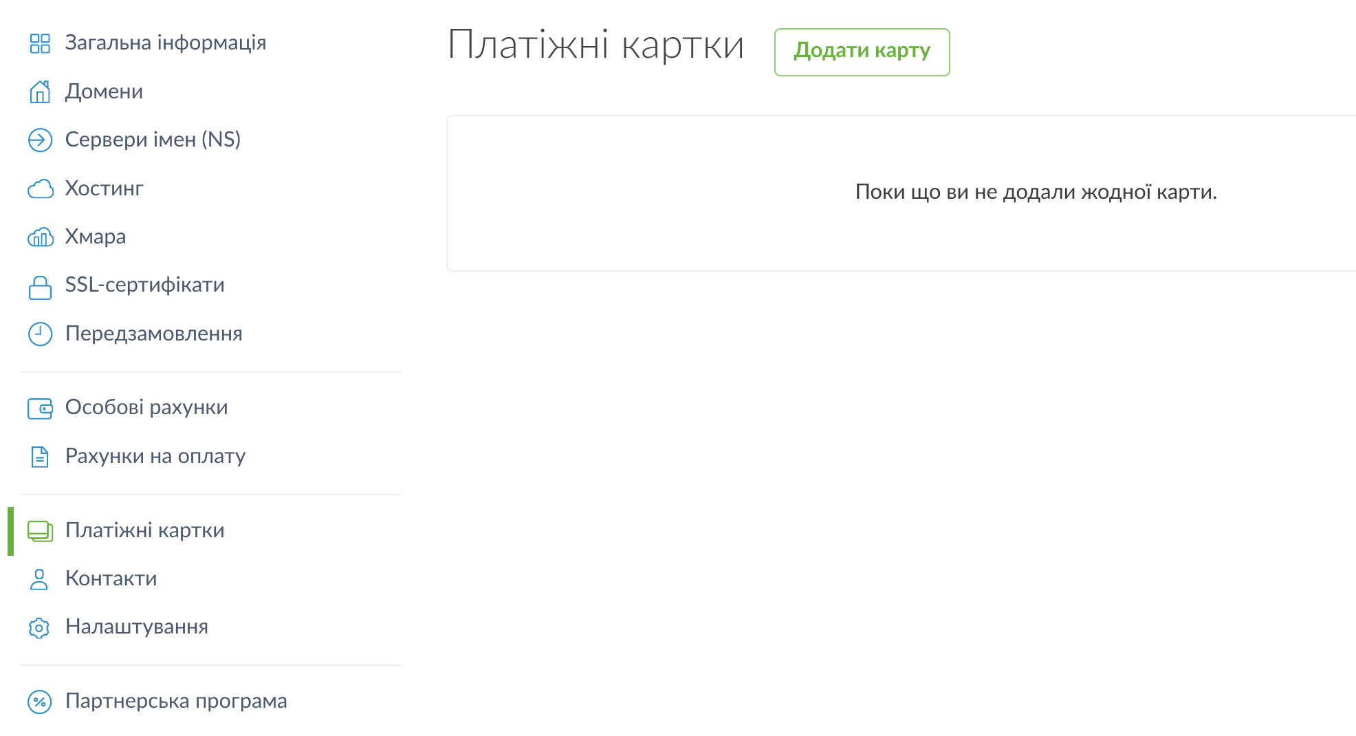 Щоб додати карту, увійдіть у ваш аккаунт NIC.UA і зліва в стовпчику виберіть пункт "Платіжні картки". Натисніть на кнопку "Додати карту":
