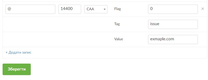 - Tag: може мати значення "issue", "issuewild", "iodef" — в залежності від типу сертифіката;