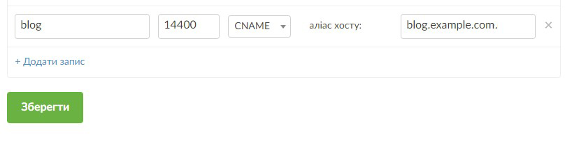 - Ім'я: через особливості роботи запису CNAME, він використовується тільки для піддомена. Наприклад, для «blog.domain.com» буде досить внести ім'я «blog»;