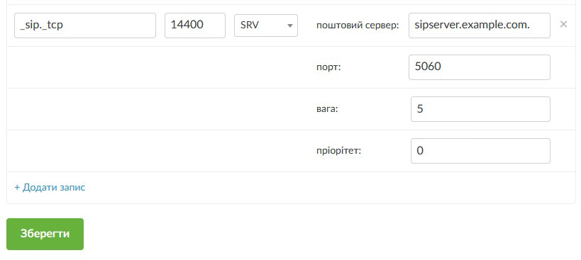 - Ім'я: повинно містити тип сервісу і протокол передачі. Для SIP, який працює по TCP, це ім'я буде "_sip._tcp". Обидва значення завжди починаються з нижнього підкреслення;