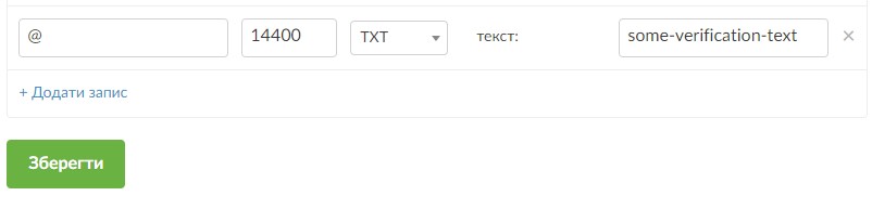 - Ім'я: для записів перевірки володіння домену зазвичай вписується ім'я "@";