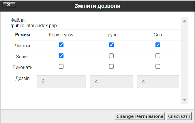 Після встановлення відповідного значення натисніть кнопку "Change Permissions". Варто зазначити, що cPanel не має функції для рекурсивної зміни прав на відміну від панелі DirectAdmin.