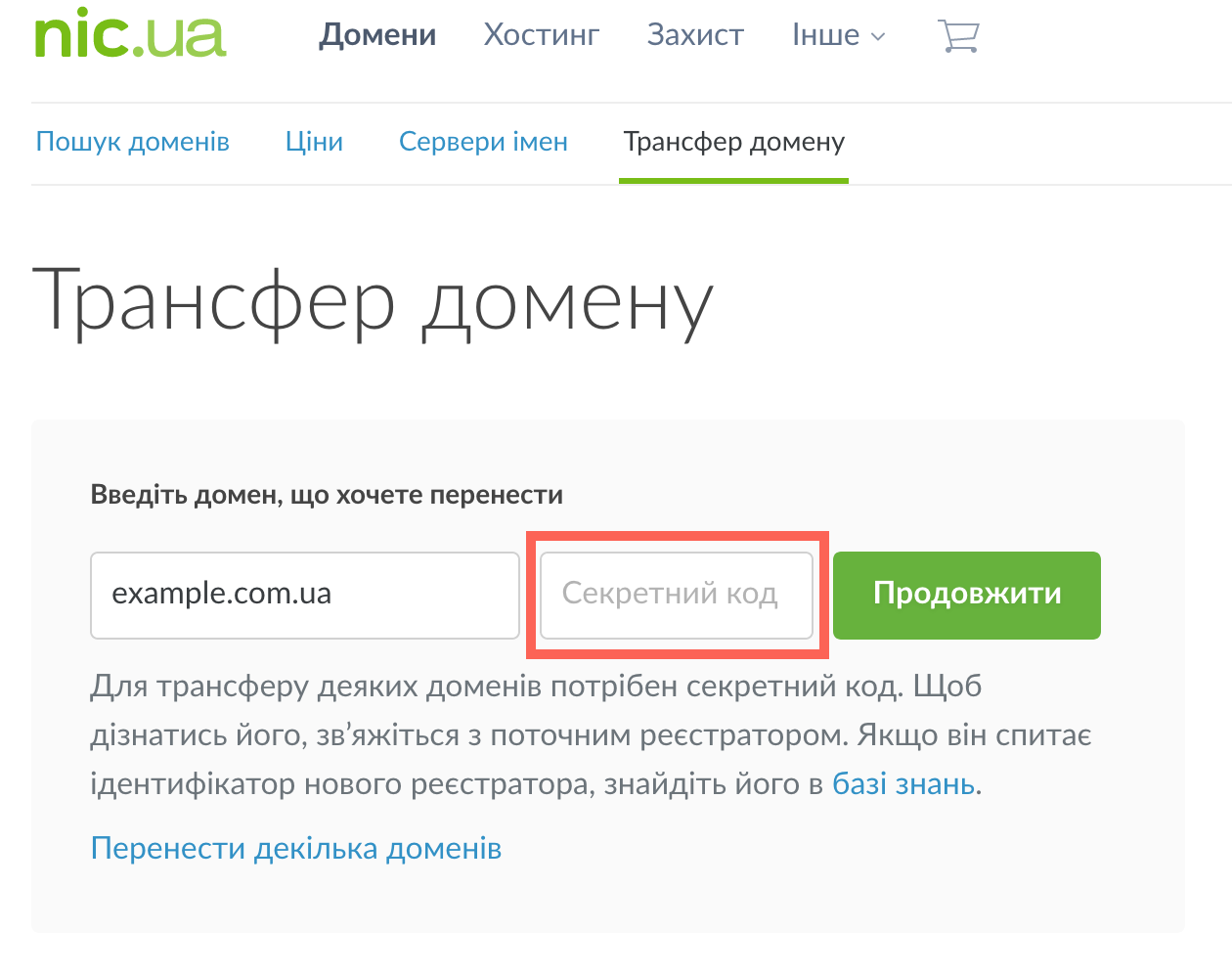 Він повинен увійти в свій особистий кабінет і відкрити сторінку трансферу. Потрібно буде ввести назву домену і його код трансферу, після чого натиснути «Продовжити».