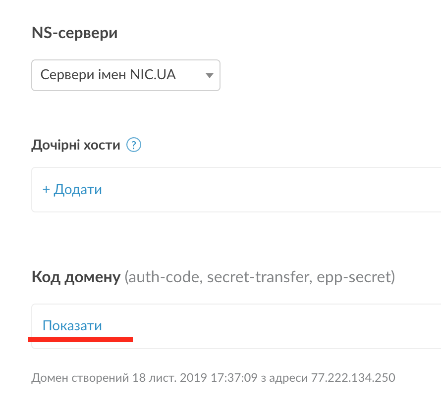 Натисніть на кнопку «Показати» — за нею і прихован код трансферу. Код вам потрібно передати власнику, у акаунт якого ви хочете передати домен.