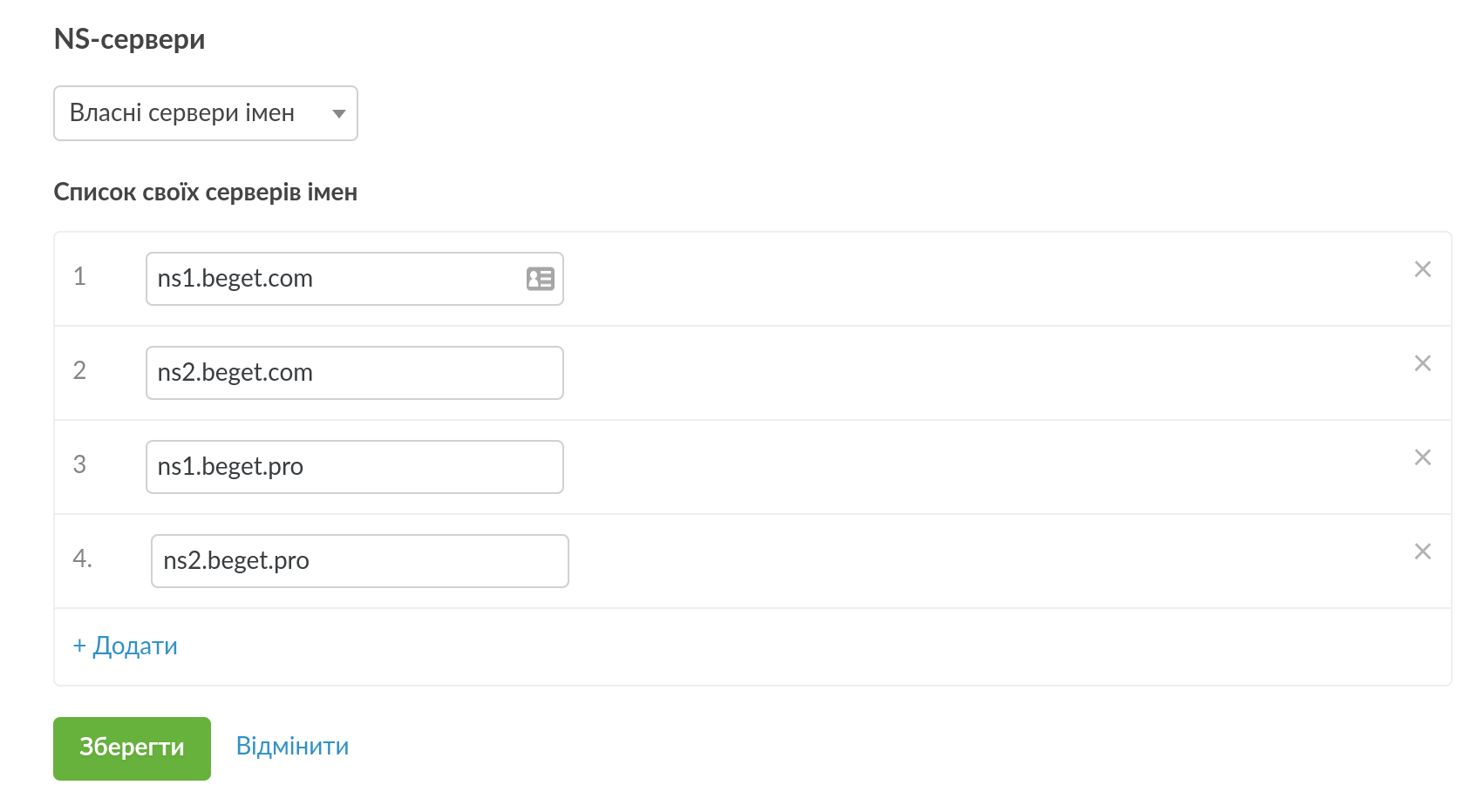 Біля пункту "Список своїх серверів імен" натисніть кнопку "Змінити". Потім видаліть зі списку поточні NS і додайте наступні: