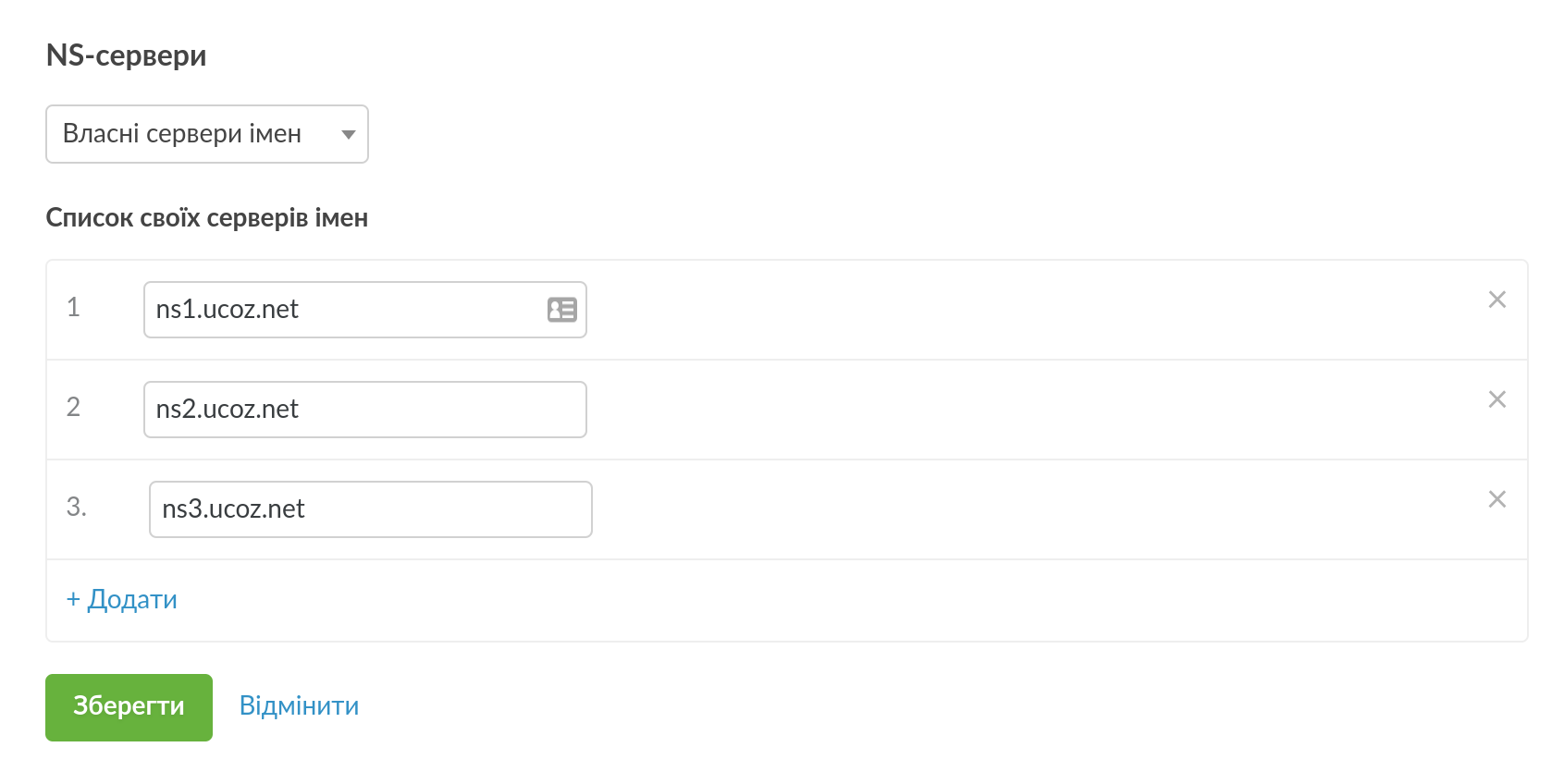 Біля пункту "Список своїх серверів імен" натисніть кнопку "Змінити". Потім видаліть зі списку поточні NS і додайте наступні:
