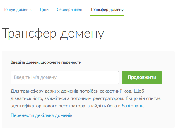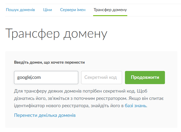 Коли коди вже у вас на руках, залишається запустити трансфер домену. Відкривайте розділ «Перенесення домену», вводите ім'я домену та натискайте «Продовжити»: