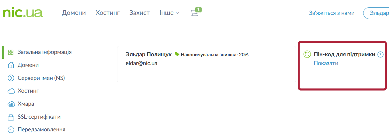 Для авторизації ваших запитів в підтримці іноді потрібно надати пін-код: це 4 цифри, згенеровані для вашого облікового запису. Підтримка NIC.UA може запросити його для підтвердження замовлення послуги, перенесення хостингу між акаунтами і інших операцій.