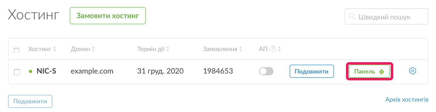 Для цього перейдіть в розділ "Хостинг" особистого кабінету і натисніть на кнопку "Панель".