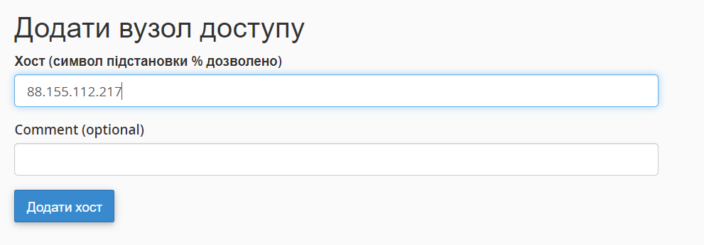 У вікні вкажіть IP-адресу хоста, з якої будете віддалено підключатися до бази даних, і натисніть кнопку "Додати хост".